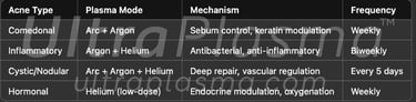 UltraPlasma™ Arc Plasma Mode (High-Energy, Surface): Precise, localized energy for sebaceous gland modulation and antibacterial action