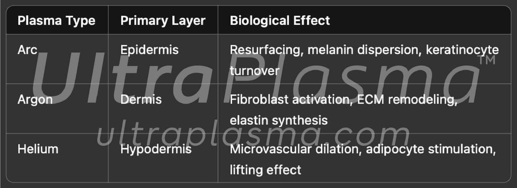 Helium Plasma (19.8–24.6 eV): Penetrates hypodermis, stimulating vascular regeneration and adipocyte activity.