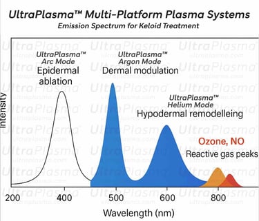 UltraPlasma™, a next-generation plasma treatment platform, integrates three gas-phase plasma modalities—arc plasma (thermal), argon plasma (non-thermal), and helium plasma (cold, focused)—with smart adaptive emission spectra and gas-ozone-NO (nitric oxide) balance. Its multimodal spectrum is tailored to induce epidermal ablation, dermal fibroblast modulation, vascular remodeling, and inflammatory resolution without deep thermal damage.
