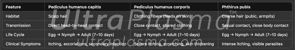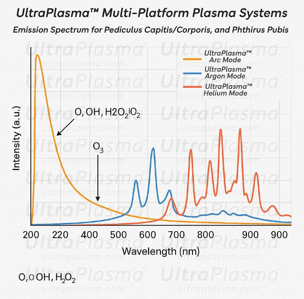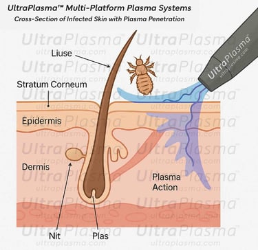 Pediculosis, caused by Pediculus humanus capitis (head lice), Pediculus humanus corporis (body lice), and Phthirus pubis (pubic lice), remains a widespread public health issue globally. Traditional chemical treatments have faced challenges due to increasing resistance and skin toxicity. UltraPlasma™ multi-platform plasma systems — integrating arc plasma, argon plasma, and helium plasma technologies — offer a novel, non-chemical approach to eradicate lice and their nits while promoting scalp and skin healing. Plasma-induced reactive oxygen and nitrogen species (RONS), including ozone (O₃), nitric oxide (NO), and singlet oxygen (¹O₂), play a pivotal role in parasitic destruction, inflammation modulation, and tissue regeneration. This article comprehensively reviews the mechanisms of action, skin layer interactions, and clinical implications of UltraPlasma™ treatment in pediculosis management.