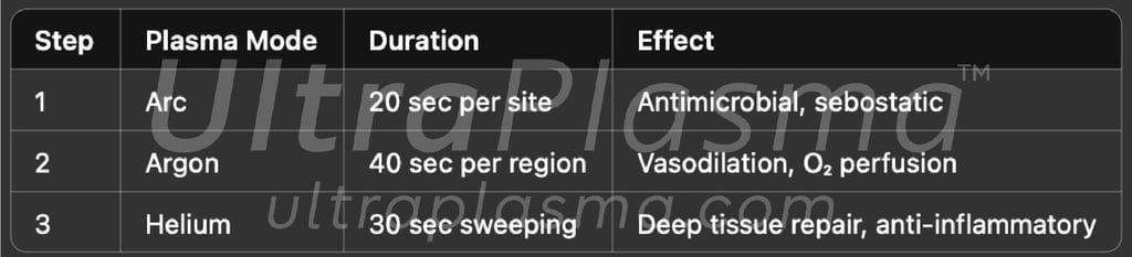 UltraPlasma™ Arc Plasma Mode: Delivers high-density electron energy causing local ionization and production of ozone (O₃), nitric oxide (NO), and reactive oxygen species (ROS) with sebostatic and anti-inflammatory effects.